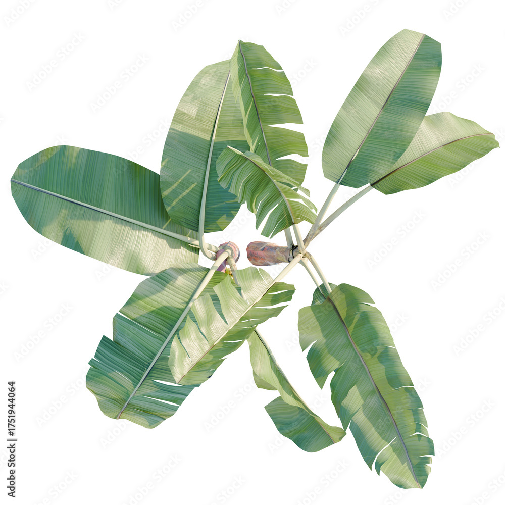 bananatree plan, top view, cutout, transparent background, isolate, Vibrant banana plant with large green leaves and developing fruit cluster