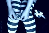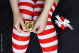 Woman with condom on the bed, contraception concept. Female legs in knee socks, romantic date in winter holidays