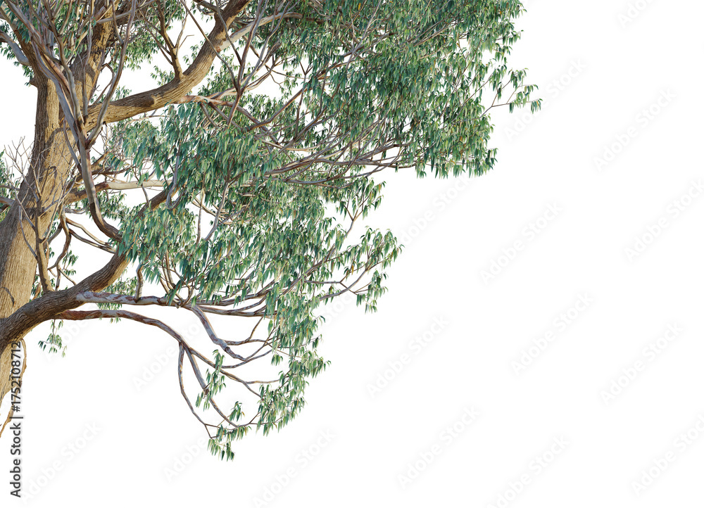 Eucalyptus macarthurii tree corner view, cutout, transparent background, isolate, Detailed eucalyptus tree branches with light green leaves and textured bark