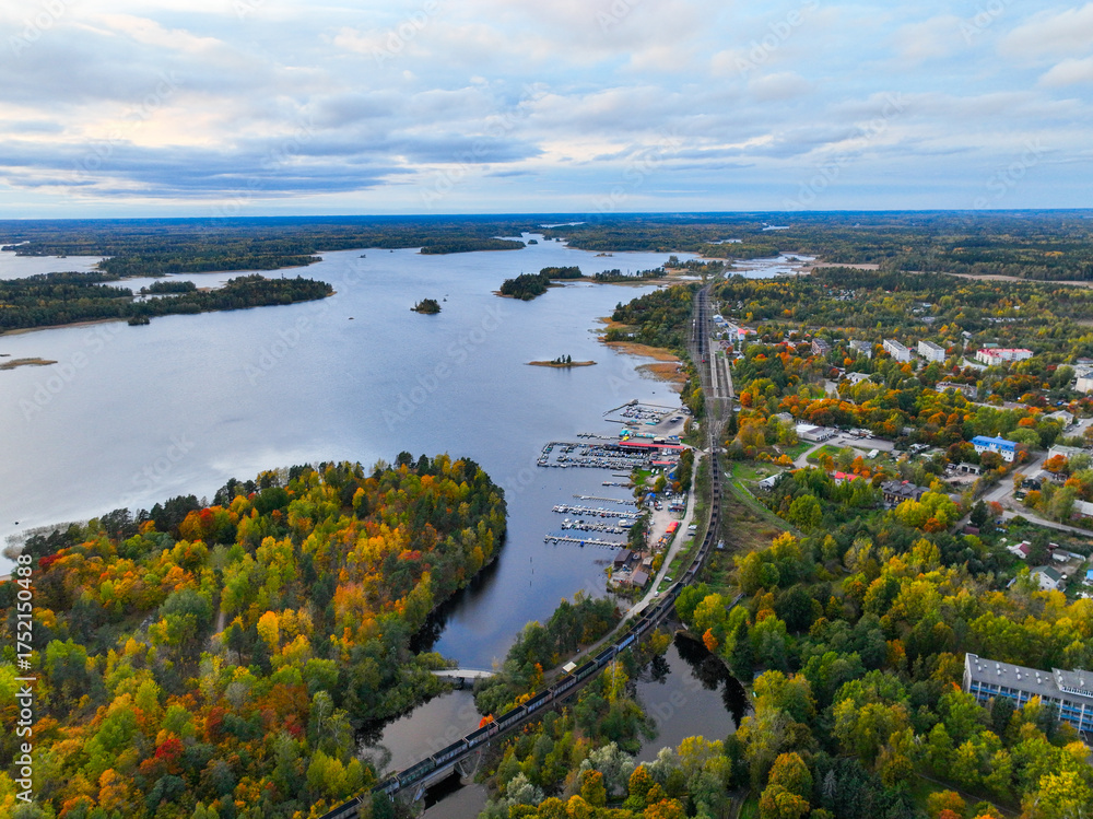 High angle panoramic view of a railway bridge crossing water, a marina, and a town nestled amongst a vibrant autumn forest and wide river