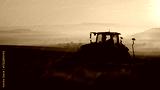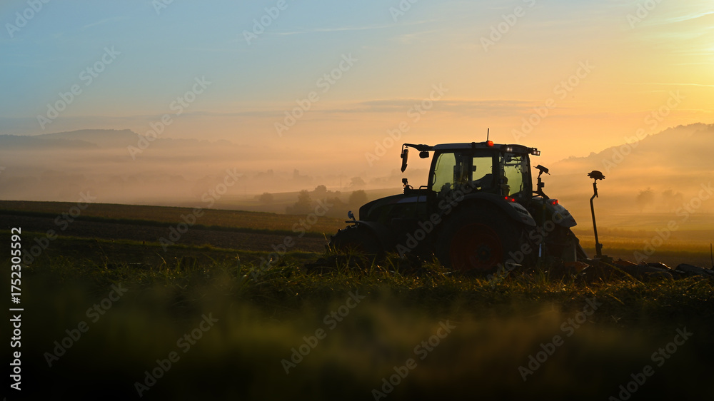 Tractor ploughing the field at sunrise morning in late summer or autumn landscape.