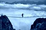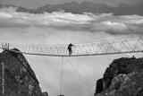Man walking on suspension bridge and looking at cloudy mountains below.
