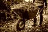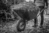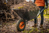 Man with wheelbarrow in the garden. Autumn garden in background. Final garden work of autumn. Garden wheelbarrow full of dry leafs and branches. Autumn garden theme.