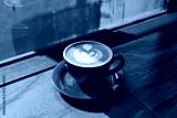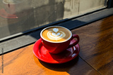 Close up view of hot cafe latte on the wooden table. red cup or mug. art. brown. dark, black, shadows. morning. relax, coffee time. cafe. coffee shop. sun shine, light. ceramic.