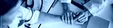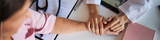 Header of Middle aged woman sitting at desk receiving comforting support from female doctor holding her hand, medical documents and stethoscope visible on table, cancer context