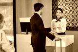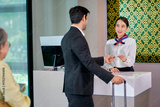 Attractive smile young woman air staff giving passport and ticket back to businessman at airport check-in counter