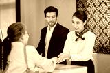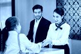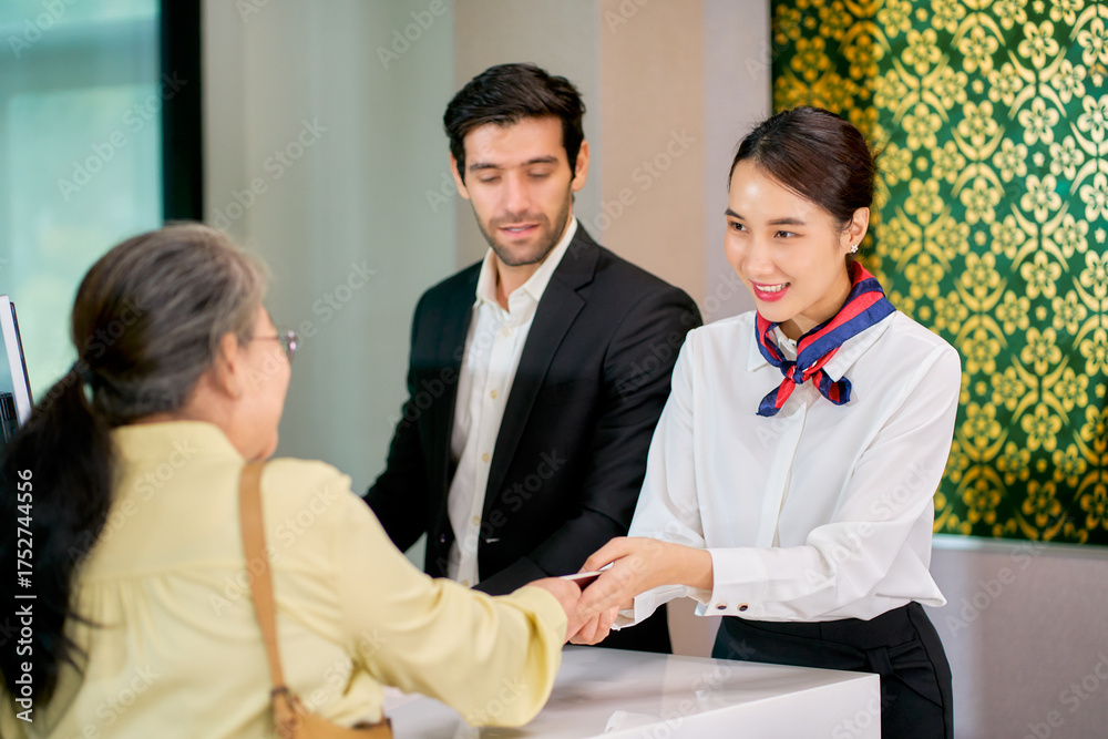 Scene of kind service with air ground staffs help the senior asian passenger to check in for travel by airline at airport check in counter.