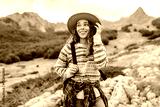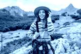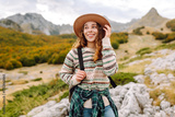 Hiker wearing hat and carrying backpack walks along hiking trail in mountains. A beautiful woman enjoys the mountain scenery and feels free at sunset. Travel and hiking concepts. Active lifestyle.