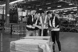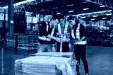 Asian warehouse workers inspect goods on pallet trucks in storage warehouse.