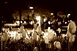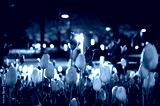 Beautifully blooming tulip flowers in a flower garden at night in Odaiba. Spring blossom background..