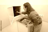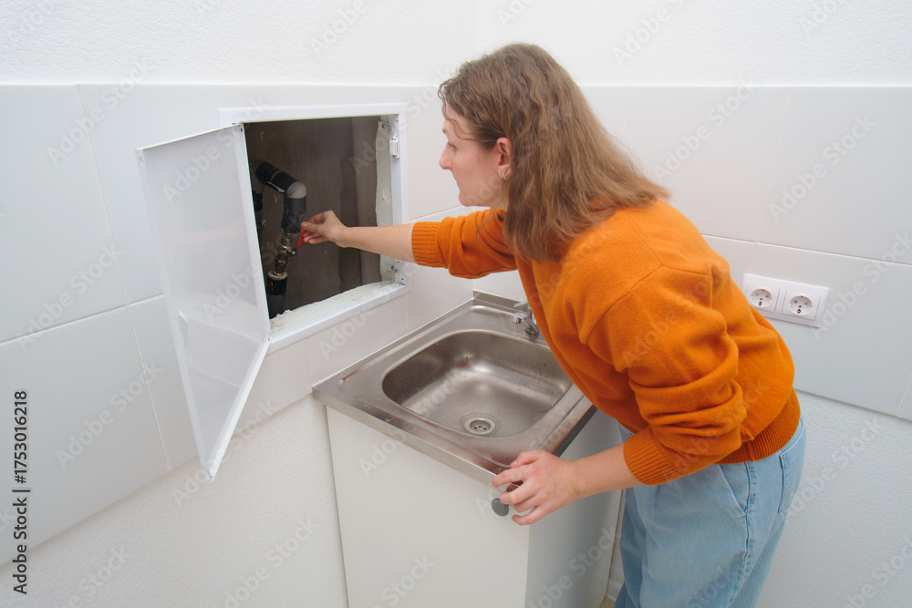Woman plumber turning off water valve under sink. Female hand adjusting pipe in utility closet. Home repair emergency concept.