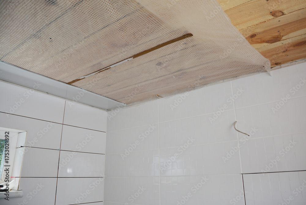 PVC Ceiling Cladding installation. Vapor barrier film for ceiling before installing PVC ceiling panels in the bathroom