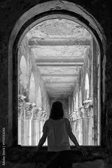 Silhouette of a woman standing at a window, looking into the decaying interior of an abandoned sanatorium in Tskaltubo, Georgia, with peeling turquoise ceilings and classical columns.