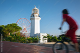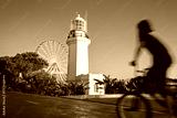 Coastal scenery with a white lighthouse, a big ferris wheel with trees and a blurry cyclist passing by. Batumi, Georgia