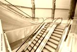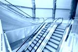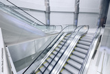 Two pairs of glass and metal escalators move at different angles within a modern public hall.