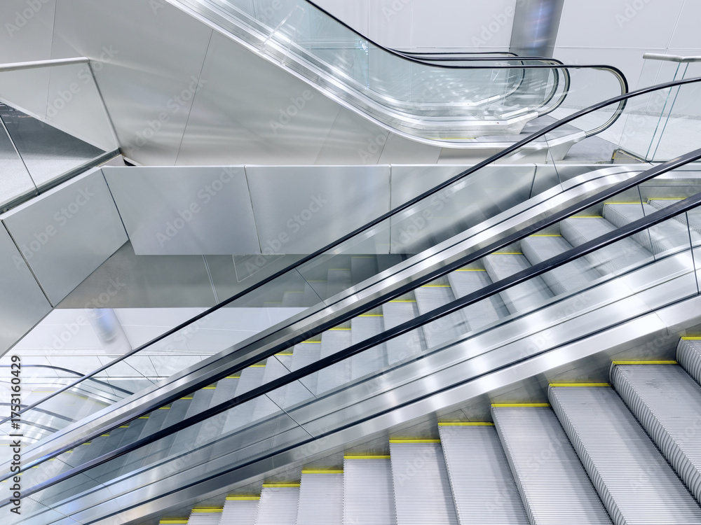 Two pairs of glass and metal escalators move at different angles within a modern public hall.