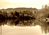 Autumn landscape scene with river, mountains and boat in a quiet factory
