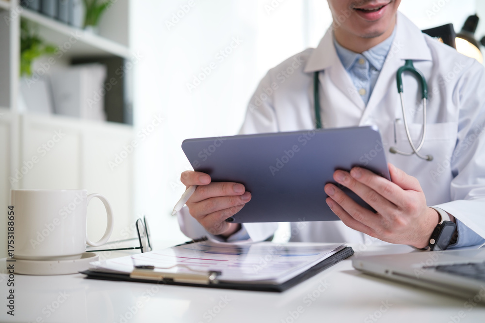 Close up of a doctor using a digital tablet to review medical reports in a modern clinic office.
