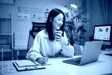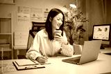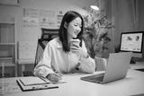 Cheerful woman enjoys coffee while working from her home office, writing notes and looking at her laptop.