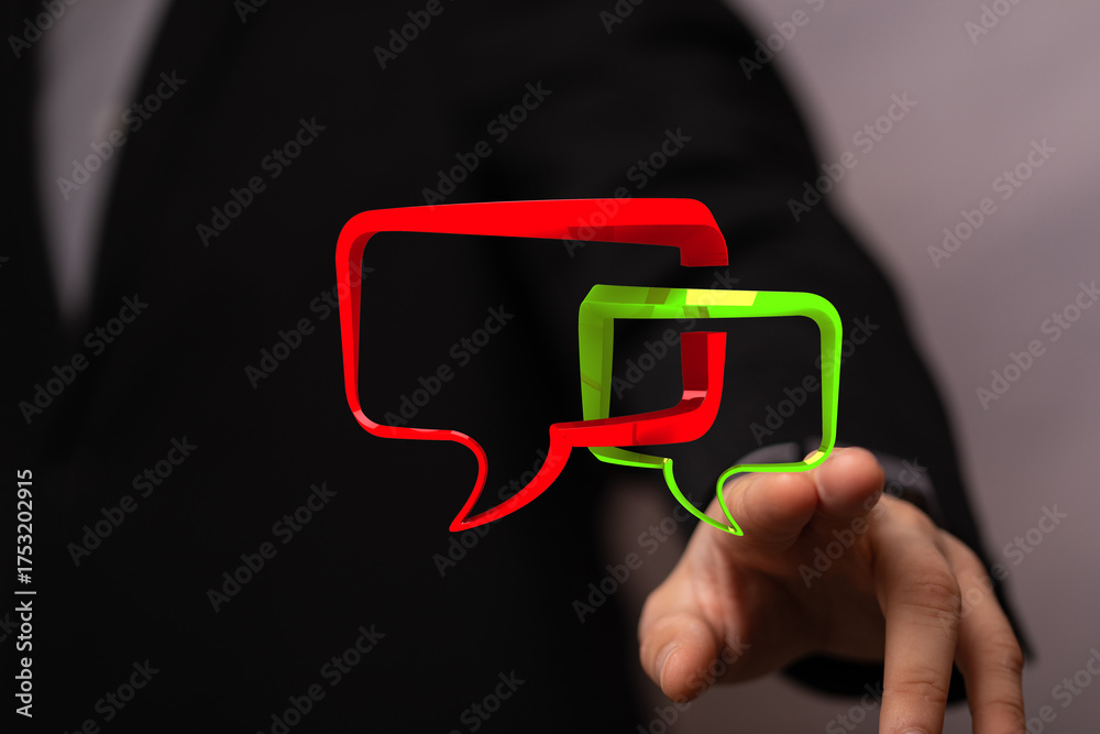 Man interacting with chat bubbles symbolizing conversation, digital interaction, communication, information, technology, data connection, and in