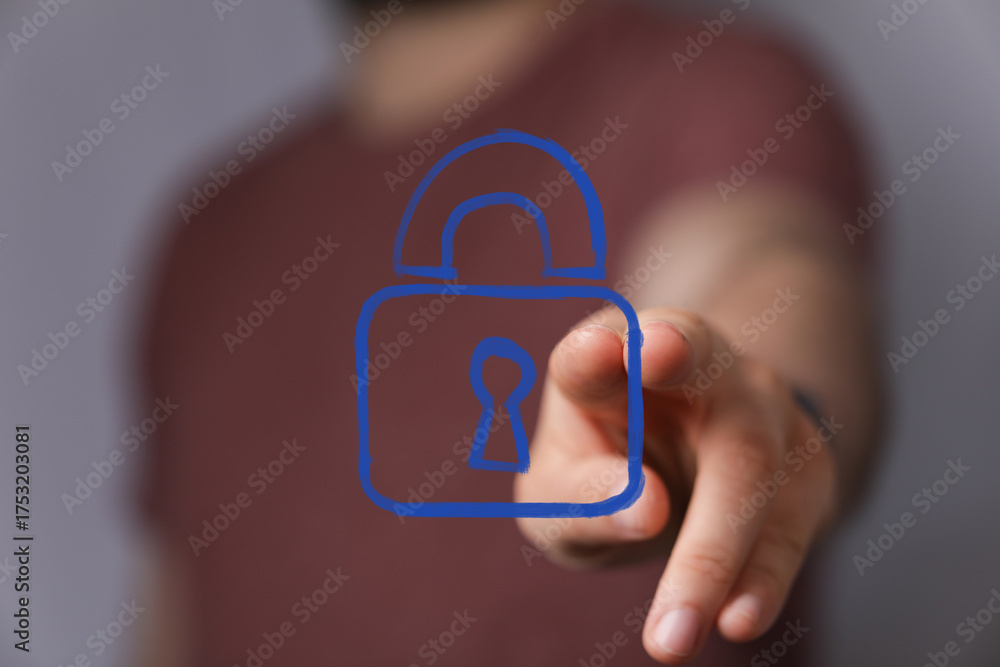 A hand interacting with a virtual padlock icon symbolizes robust digital security, data protection, and online privacy in the digital age.