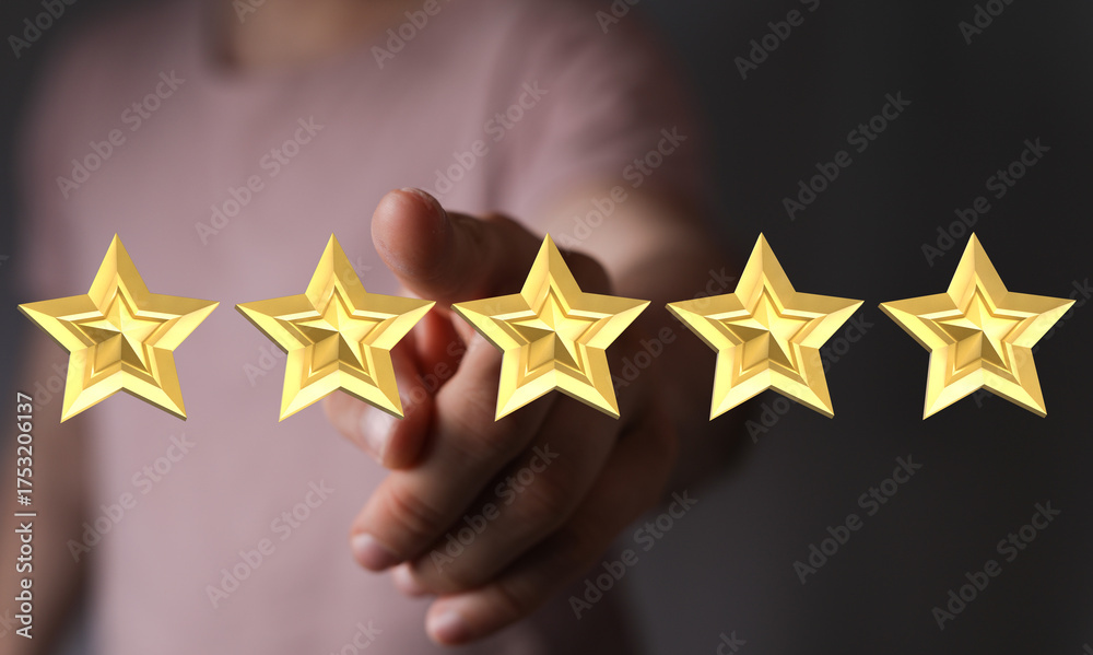 A hand pointing at five gold stars representing excellent rating, positive feedback, customer satisfaction, and high quality. Perfect for busine