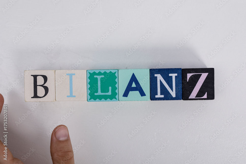 A creative photo featuring wooden blocks arranged to spell 'Bilanz' in German against a white background, perfect for financial or educational t