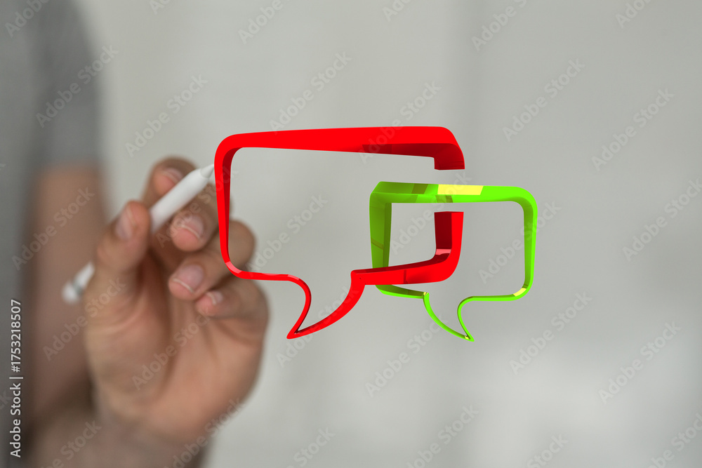 Person drawing speech bubbles. Communication concept, digital interaction, visual message. Red and green speech bubbles in focus.