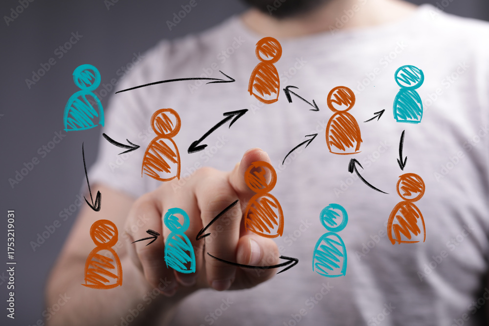 Hand interacting with a vibrant digital network of interconnected people icons, symbolizing business connections, team collaboration, social med