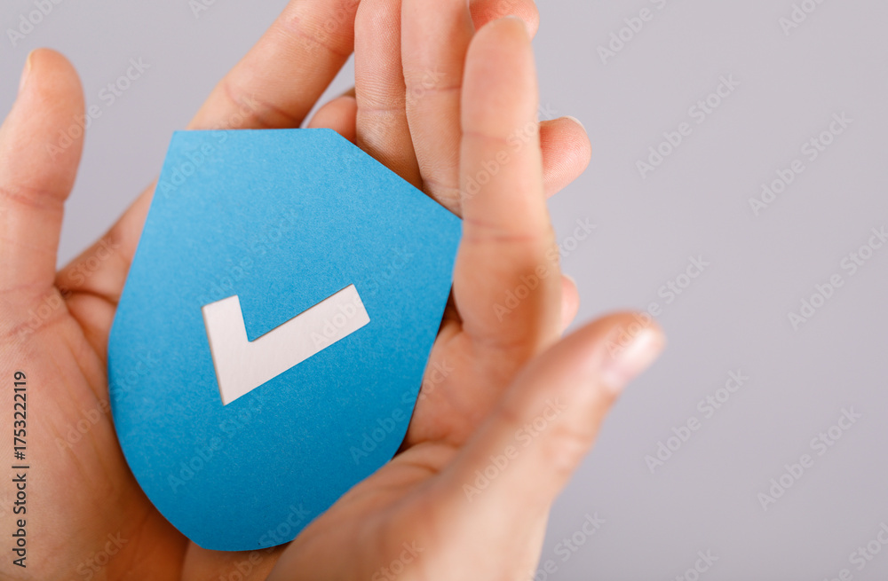 Close-up of a hand holding a blue shield with a white checkmark. Represents security, approval, or a positive concept in a clean, modern style.