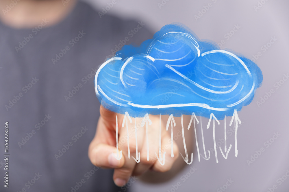 Hand pointing at a cloud with upward arrows, symbolizing data upload, cloud storage, and digital technology.