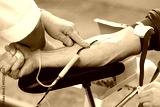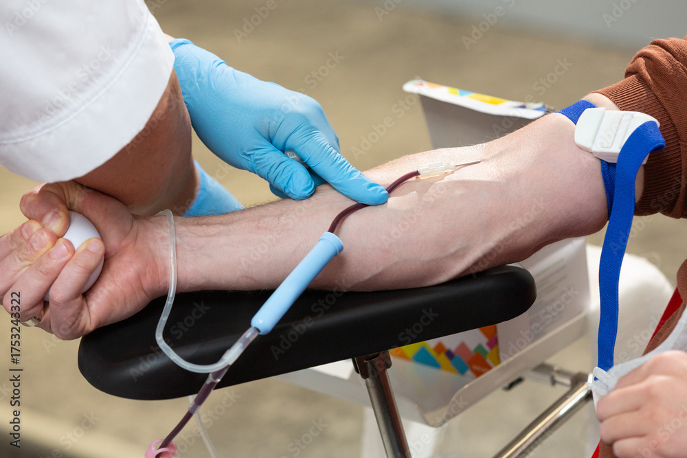 Qualified therapist connecting blood transfusion system to a donor.