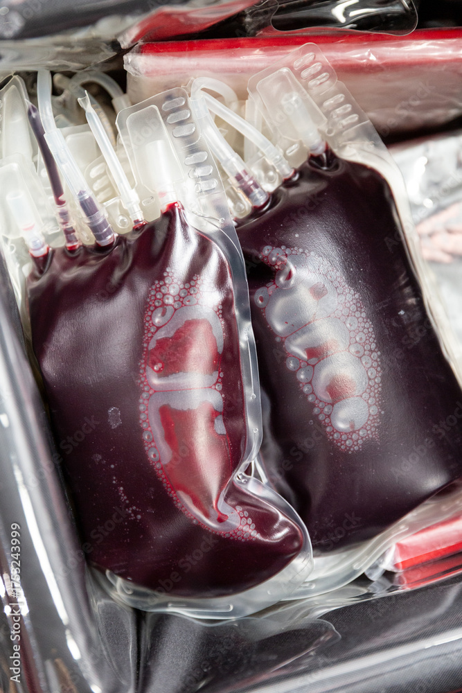 Blood bags in temperature control refregerator case filled with donor blood.