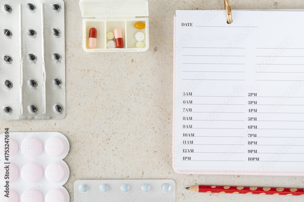 Healthcare concept with open pill organizer, medication list and blister packs, pharmaceutical composition showing treatment, prevention, medicine schedule and vitamins management