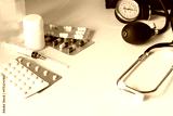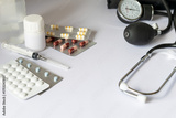 Stethoscope with pills, tablets and medical supplies on white background, healthcare and diagnosis concept representing medicine, pharmacy, prevention and hospital care