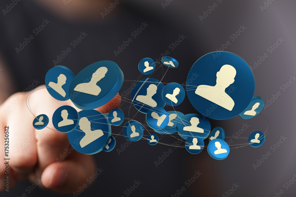 Digital composite of a hand with connecting icons representing social network, for use in presentations and websites.