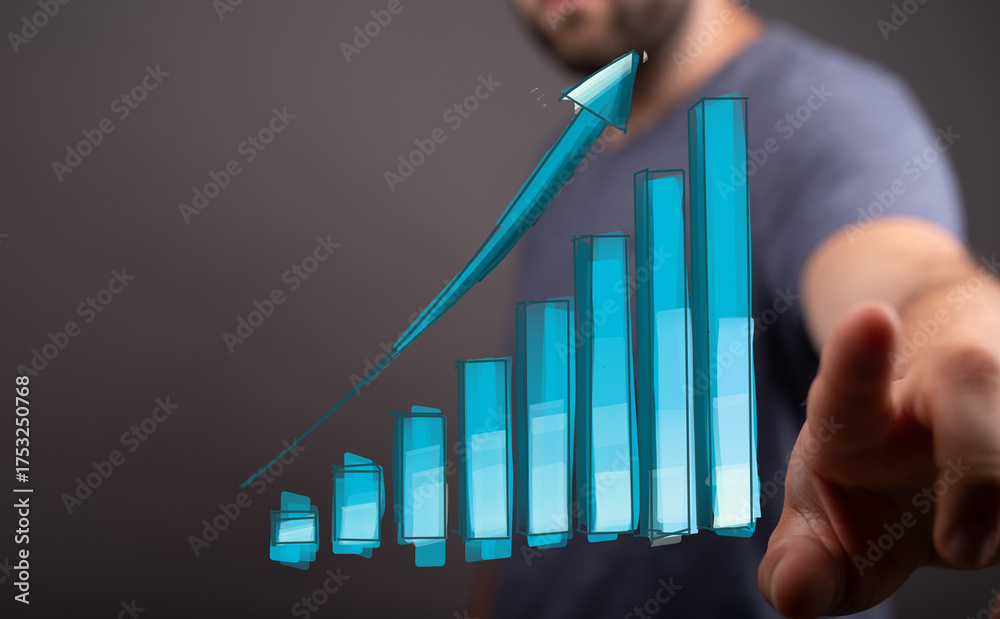 Stock photo of a hand pointing at an upward trending graph, symbolizing growth, success, and business strategy.