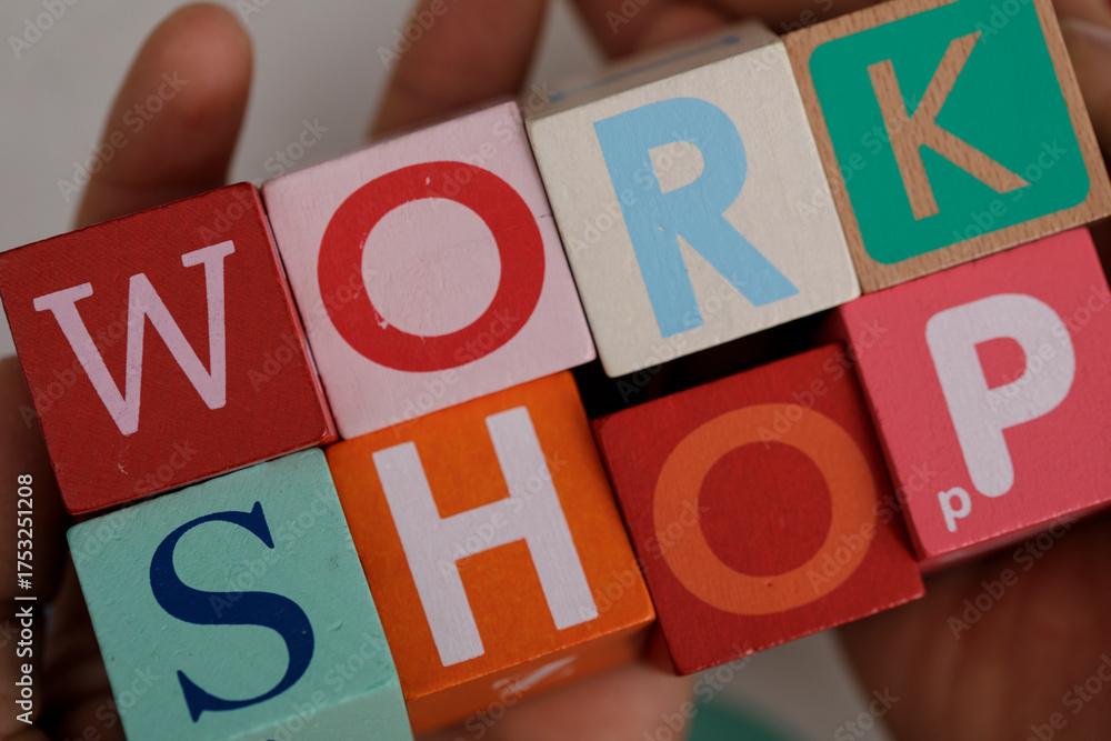 Close-up shot of a hand holding colorful wooden blocks spelling 'WORKSHOP'. This image symbolizes learning, education, collaboration, and creati