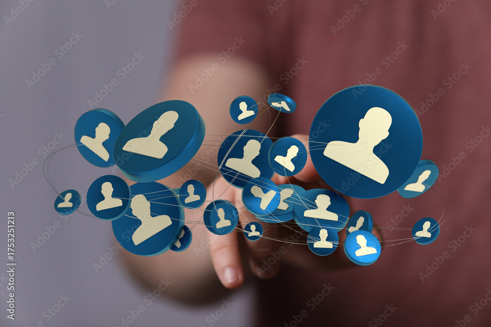 Hand interacting with digital profile icons, social media network concept of human resources or teamwork, connected users, community.