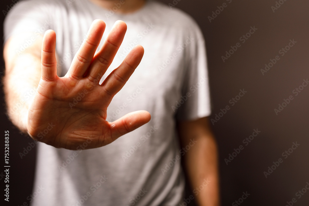 Image of a man raising his hand in a gesture of stop, denial or prohibition. Represents concepts of refusal, protection, or boundary setting.