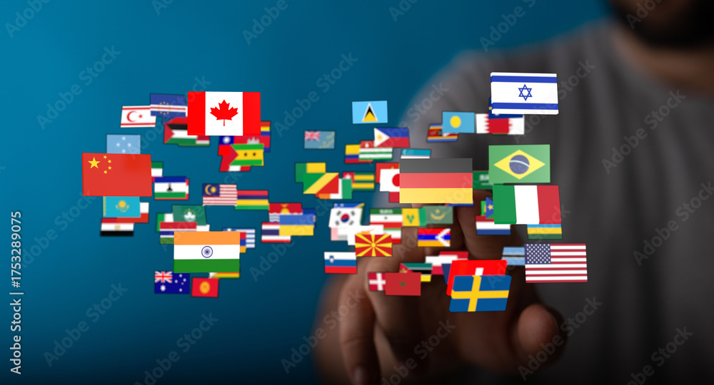 Conceptual image featuring a person interacting with flags from various nations, symbolizing global communication and international connections.
