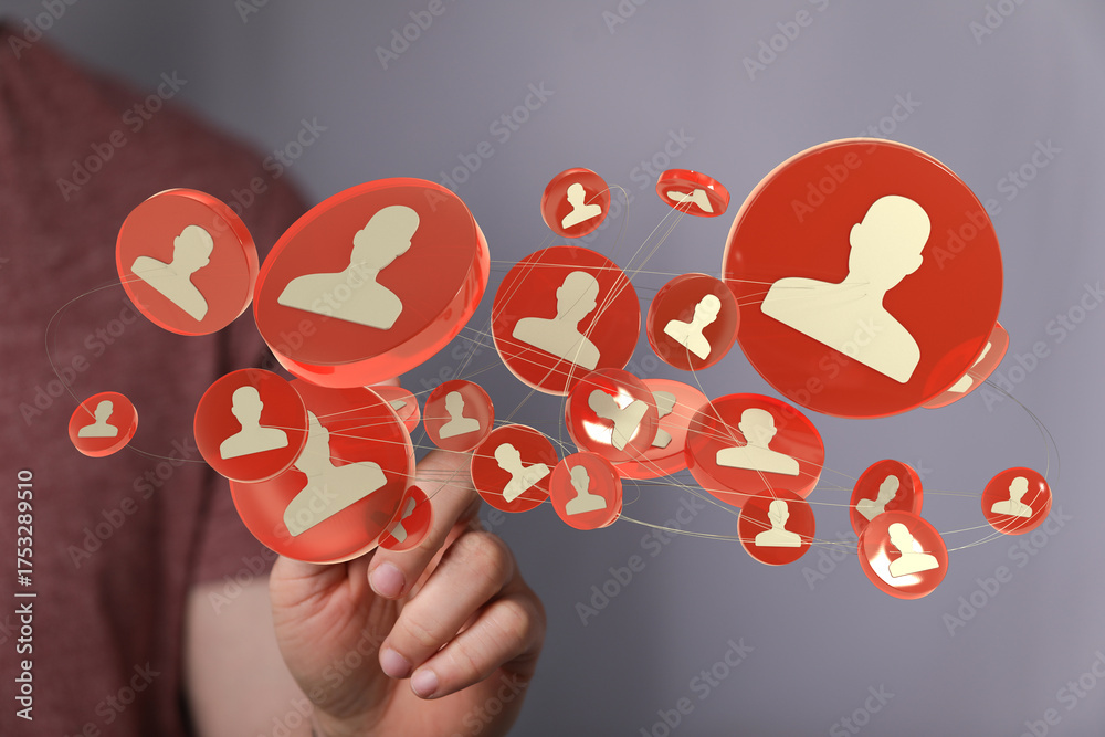 Abstract image illustrating social networking, connection and communication using stylized avatar icons linked together. 144 chars