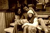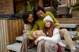 Mother, grandmother and granddaugter sitting on wooden patio, hugging.