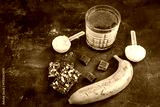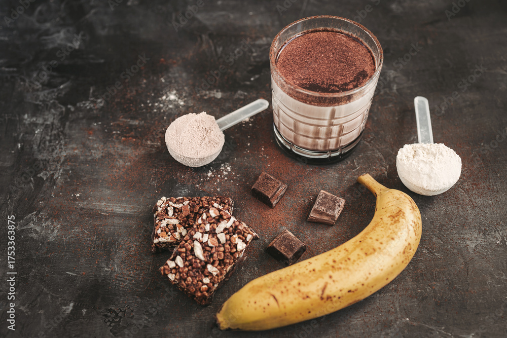Glass of protein shake with two whey protein powder scoops, banana, granola bars and chocolate pieces on dark background, fitness nutrition concept
