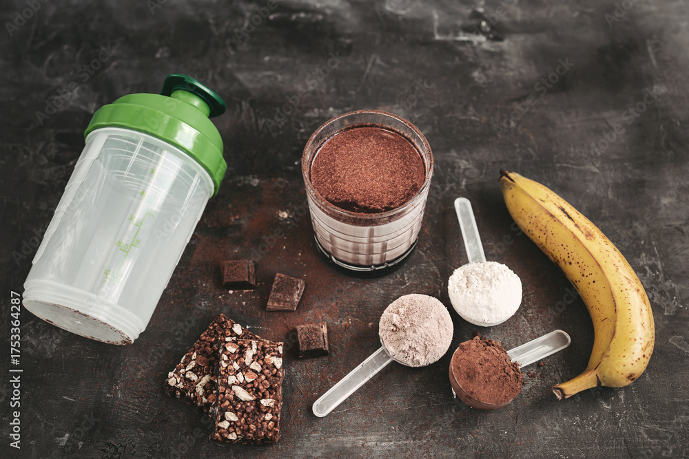 Glass of protein shake with three whey protein powder scoops, plastic shaker, banana, granola bars and chocolate pieces on dark background, fitness nutrition concept