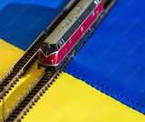 A model diesel locomotive against the backdrop of the Ukrainian flag.