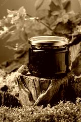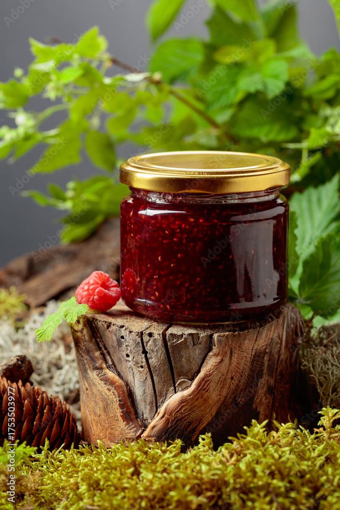 A jar of raspberry jam with fresh berries on an old tree trunk in the forest.