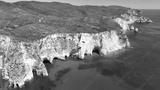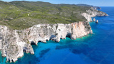 Aerial drone photo of famous caves of Agalas a popular yacht and sail boat place with white steep volcanic rocks and turquoise crystal clear sea, Zakynthos island, Ionian, Greece