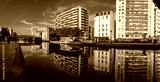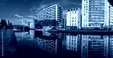 Paris, France - 10 11 2025: Ourcq Canal. Panoramic view of a colorful touristic boats, people walking, buildings and bridges reflecting on the water