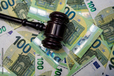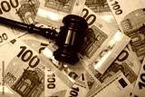 Euro banknotes with judge gavel, legal justice, regulation and business corruption concept